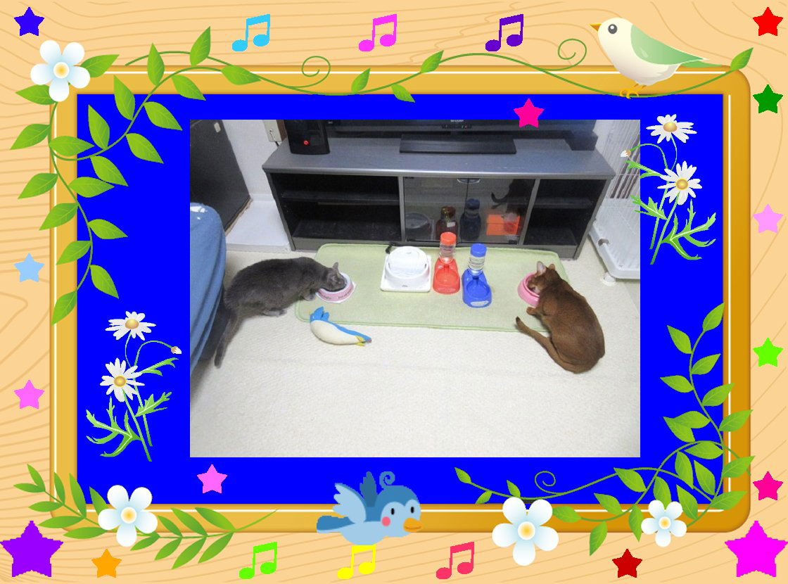 これは昨日に頂いた写真…、一所懸命、ご飯を食べている2にゃんの姿…、良い光景。