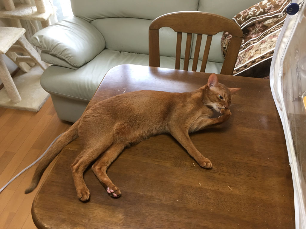 自由奔放なアビのすけ…、本当に純粋なアビシニアンの男の子。 2件の返信 これは、おととい、7/1(月)の午後4時過ぎ、1階のテーブルの上で寛いでいたアビのすけ君。 アビのすけは体がデカいので、横たわるとテーブルの半分が埋まってしまいます。 電気を付けたら、イカ耳になってたアビのすけ君。(笑) そして、のんびりと爪を噛み噛み。 アビのすけを見ていると、本当にストレスフリーで生きてる感じがする。 多分ですが、アビのすけ、気持ち良く我が家で暮らしてくれていると思います。