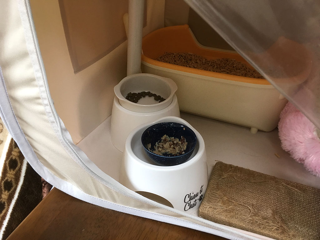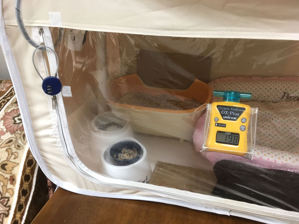事の経緯はこういう事で、ロシ子が晩ご飯後、酸素ハウスの外で休憩中に、アビのすけが酸素ハウスのチャックに付いている紐をくわえてチャックを開けて…。
