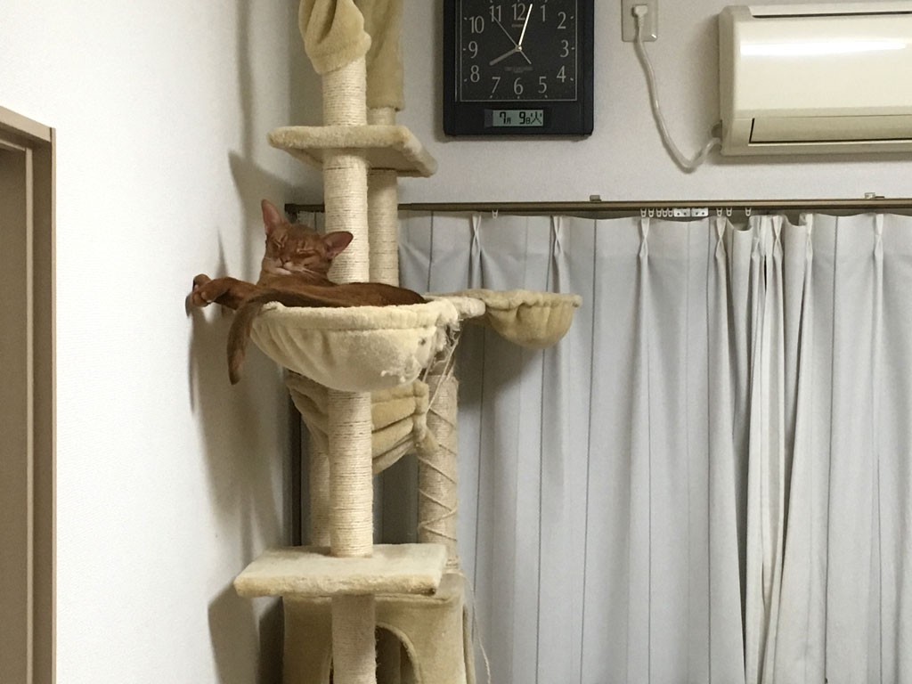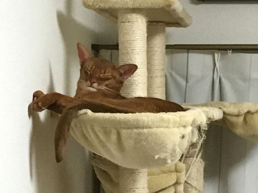 iPhone-20190709_2002-2キャットタワーのにゃんモックで居眠りしていたアビのすけ君。