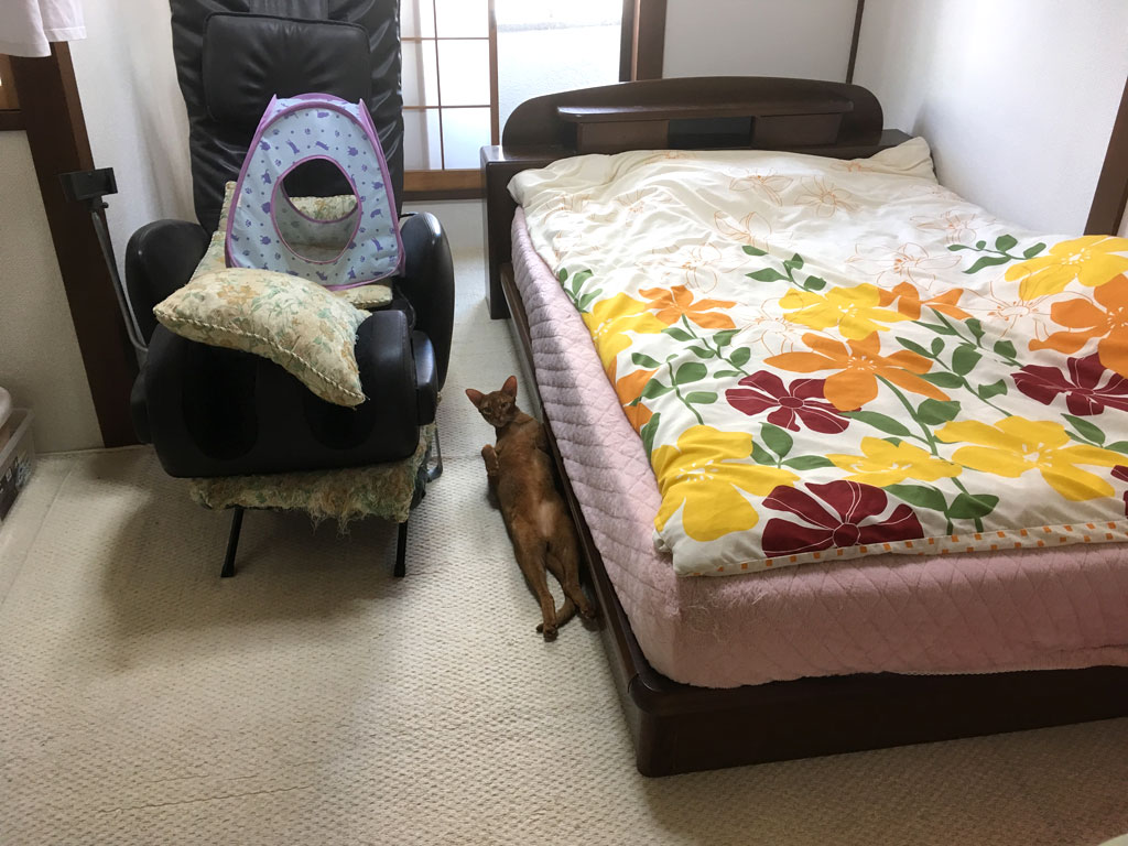 これは、3日前の7/25(木)の午後2時前の事でしたが、何か用事があったんだったか、私が2階に上がるとアビのすけがここで伸びて仰向けになって寝ていて。