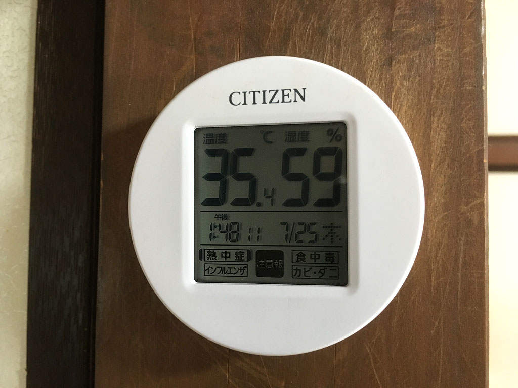温度計を見てみると、やはり気温は35℃もあって、アビのすけ君、1階で寛げば良いのに。