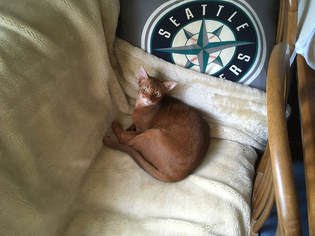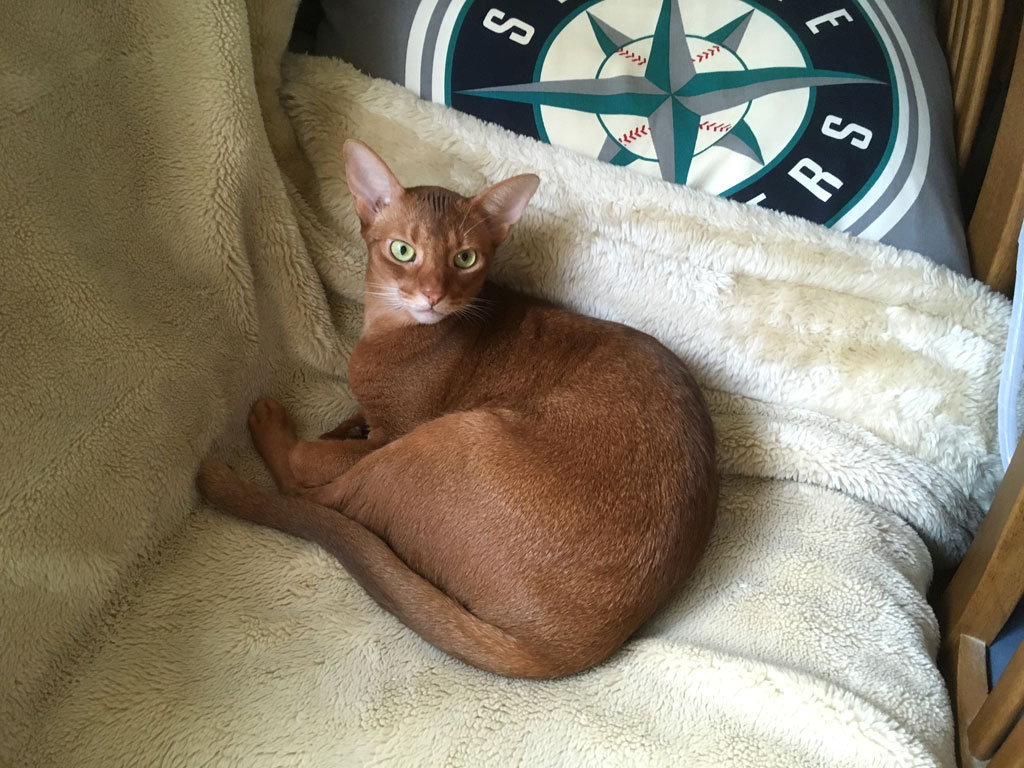 私の匂いが付いていて落ち着くのか、あるいはここが寝やすいのか、相変わらず、朝から思い通りに生きているアビのすけ君。(笑)