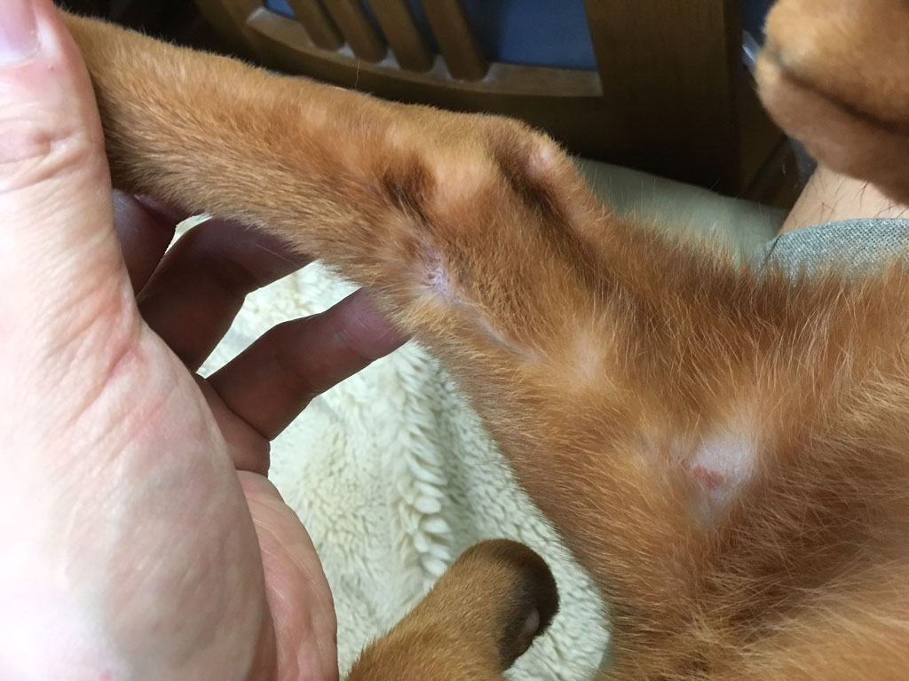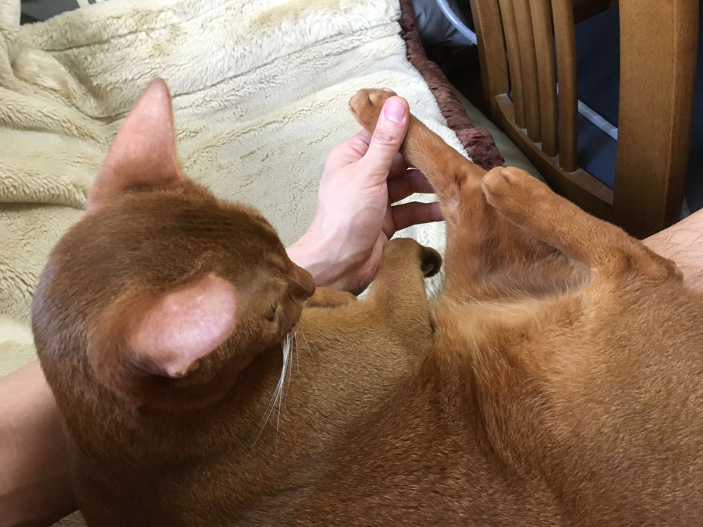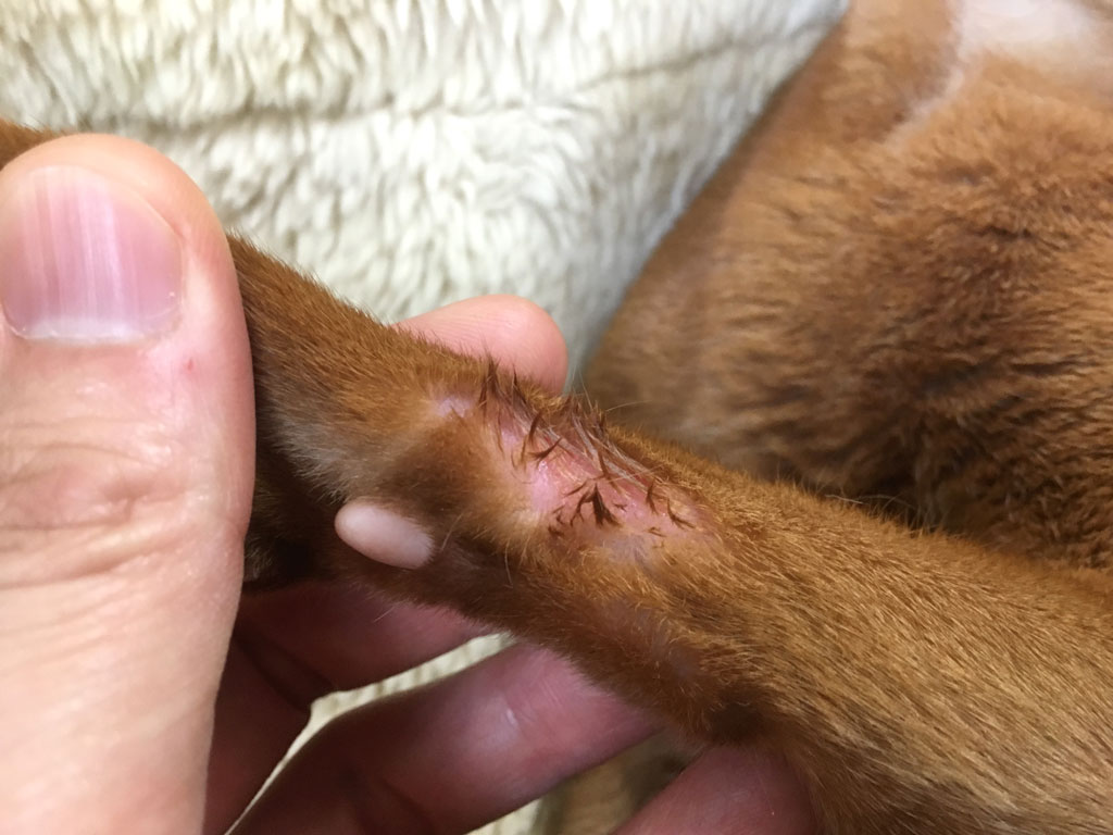 これは、3日前の8/9(金)の夕方4時半の事でしたが、アビのすけがお手々をペロペロしていたので、もしやまた新たな皮膚炎が出来ているのではないかとアビのすけのお手々をチェックしてみたら、やっぱり出来ていた…。