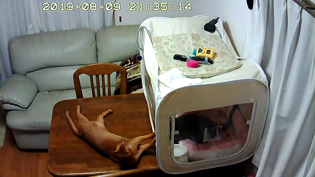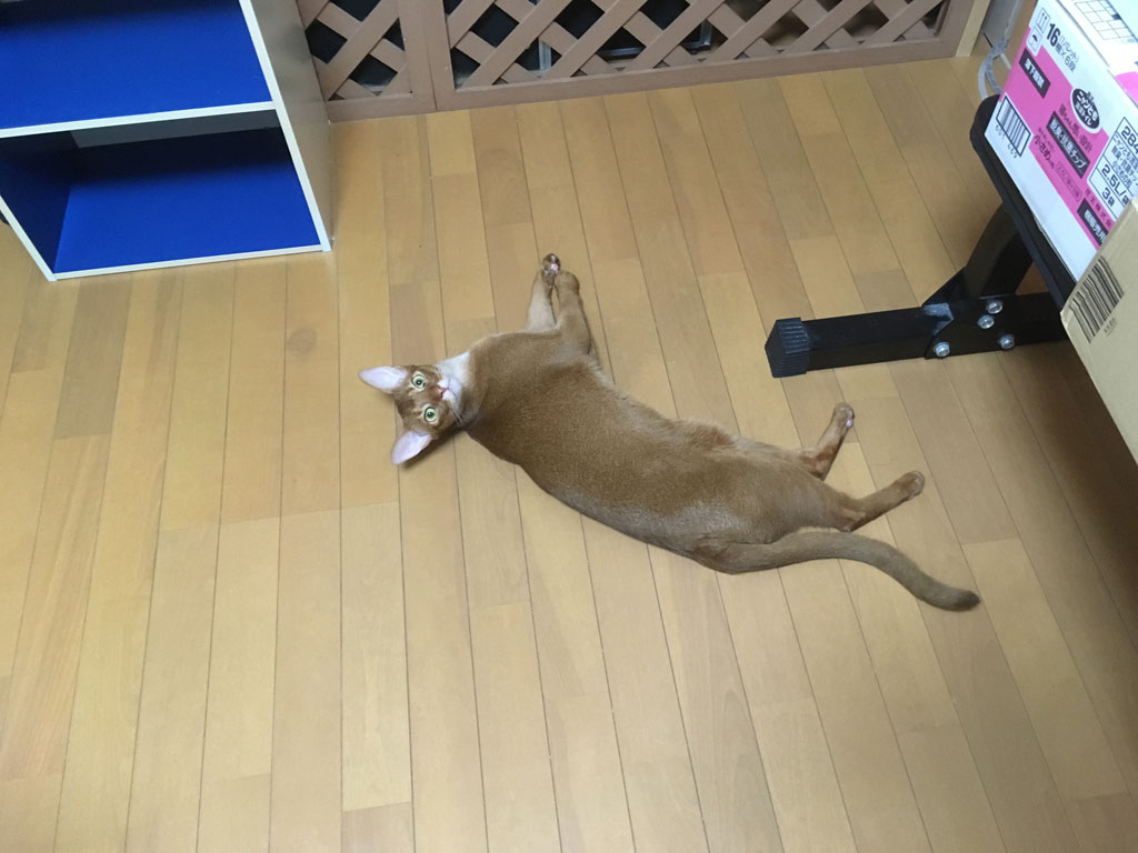 iPhone-20190809_1638-1今日のアビのすけのブログも簡単に…、これ、4日前の8/9(金)の夕方の事…、暑い季節は毎度の事ですが、この日も床に寝転がっていたアビのすけ君。