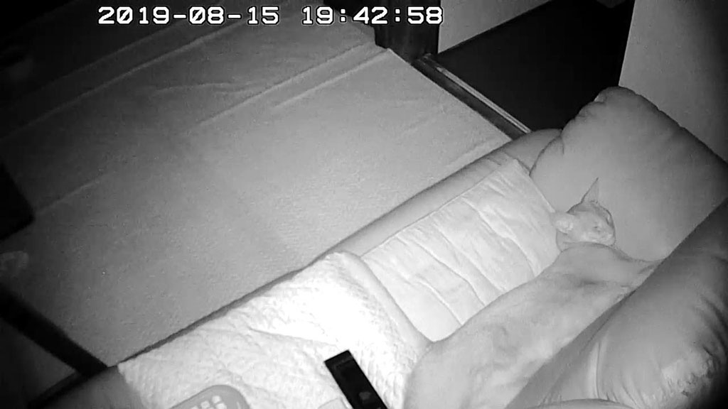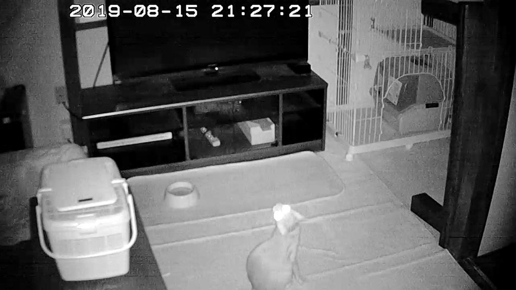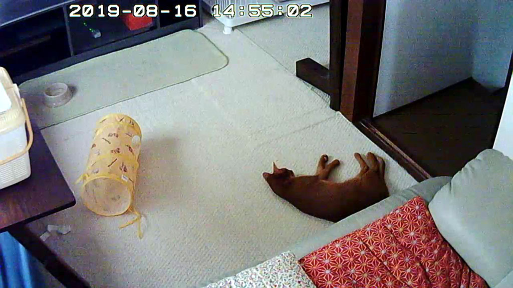 これはその前日の8/15(木)の夕方…、台風10号が直撃して家の中は真っ暗でしたが、やはり、テレビ台の所にいたロシ子から少し離れた所にいたアビのすけ君。