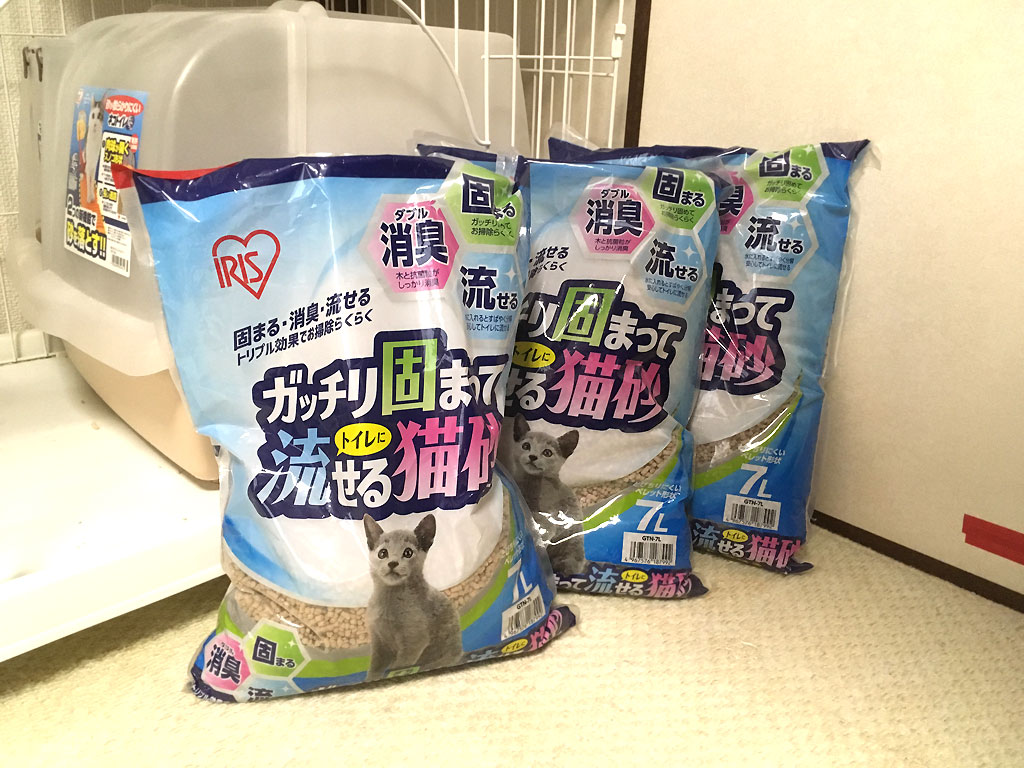多分、2年とか3年前に買った猫砂だと思いますが、当時、ロシ子がこれでトイレをしてくれなかったので放置されっ放しになっていたのですが、やっと日の目を見た。
