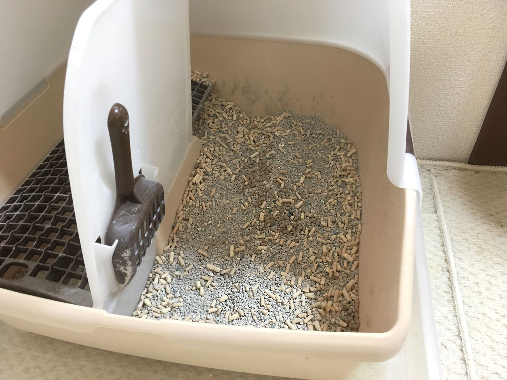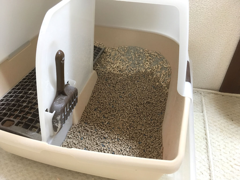 そして、ケージの中の猫砂と同様、こちらの猫トイレも上から旧の猫砂で覆って補充は完了。