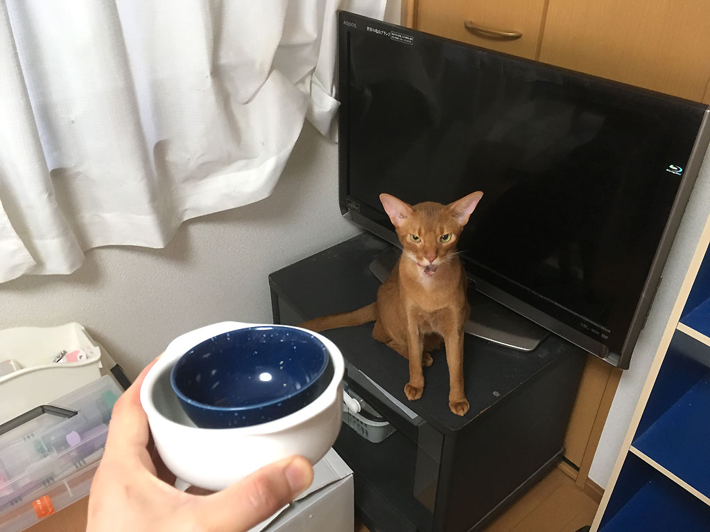iPhone20190909_1354-1これは、4日前の9/9(月)の午後2時の事…、この日は私の母親が来ていたのでしたが、間食のちゅ~るを食べ終えたアビのすけ君。