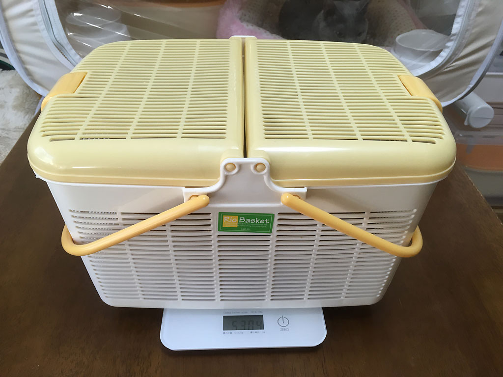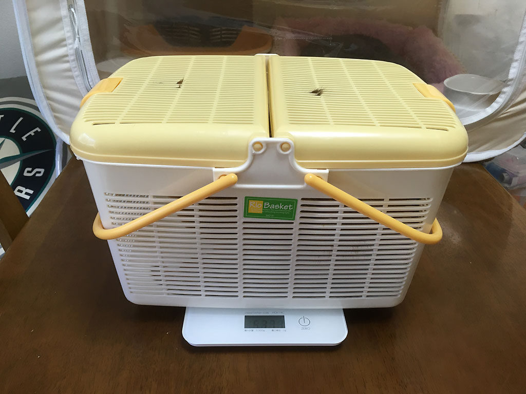 これは、ちょうど1週間前の10/9(水)の朝8時40分にした、アビのすけの体重測定の様子。