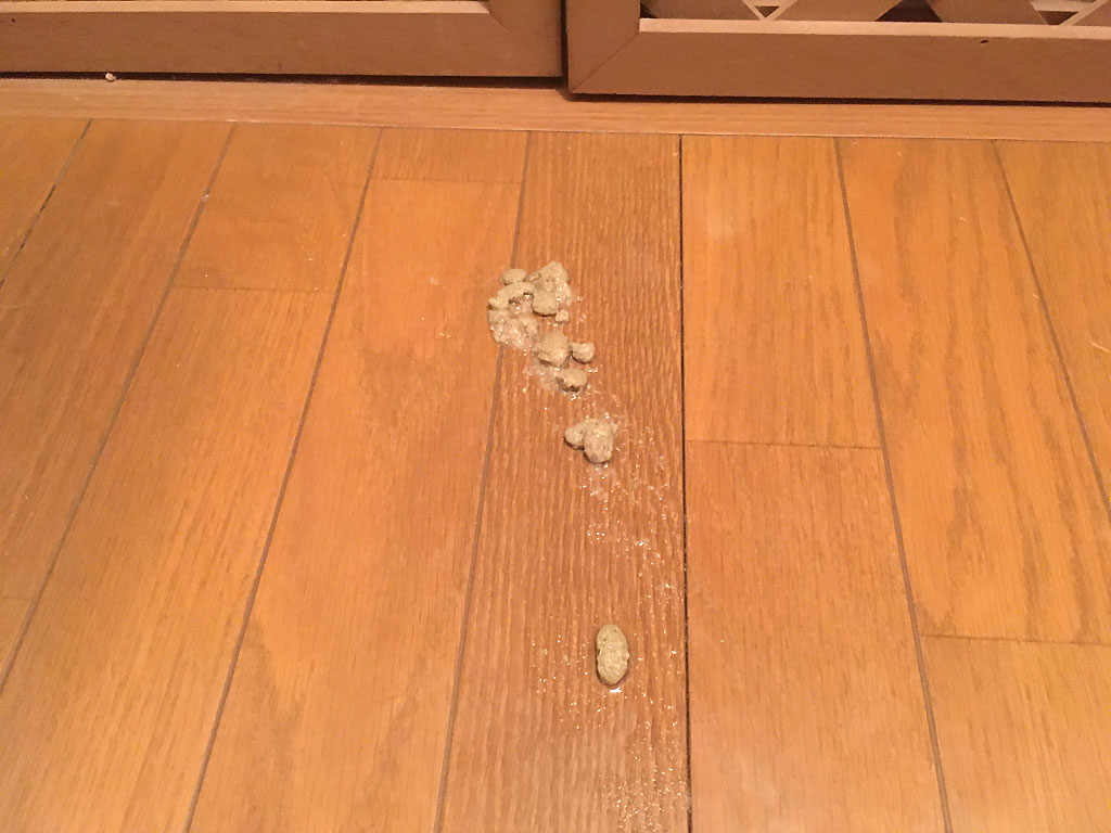 これは、今朝の未明の4時過ぎ…、いつもよりも少し寝坊した今日の未明は、いつも通り、ロシ子の水のお皿をピックアップして、台所で洗って、またロシ子の所に持って行こうとした時に、ここでアビのすけのゲボを発見。