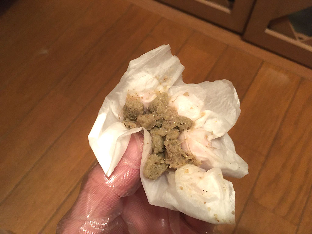 アビのすけのゲボ…、昨日の夜中0時から今朝の4時までに間違いなくアビのすけが吐いたゲボ…、ロシ子はずっと酸素ハウスの中だったから…。