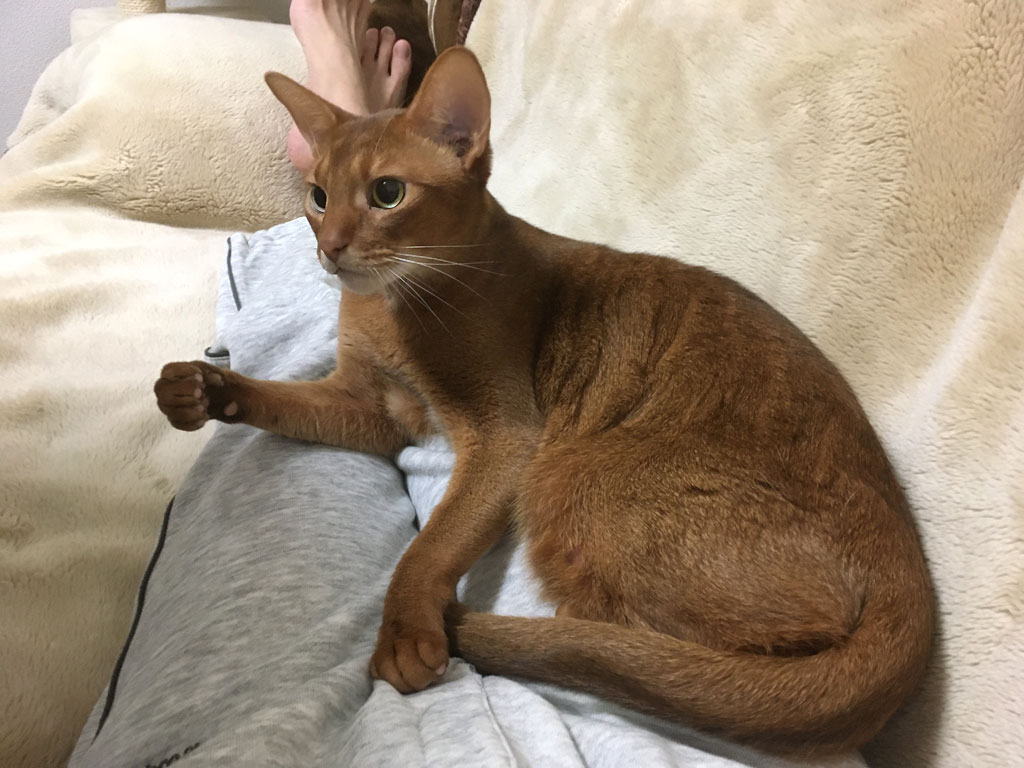 この日はその前に、寝床のソファーに横になっている私の太ももの上に乗って来たアビのすけでしたが、何かに夢中。