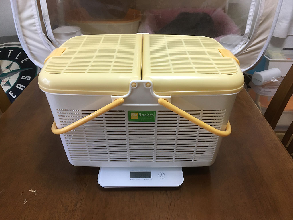iPhone20191106_0908-1そしてこれは、今週、3日前の11/6(水)の朝のアビのすけの体重測定の様子。