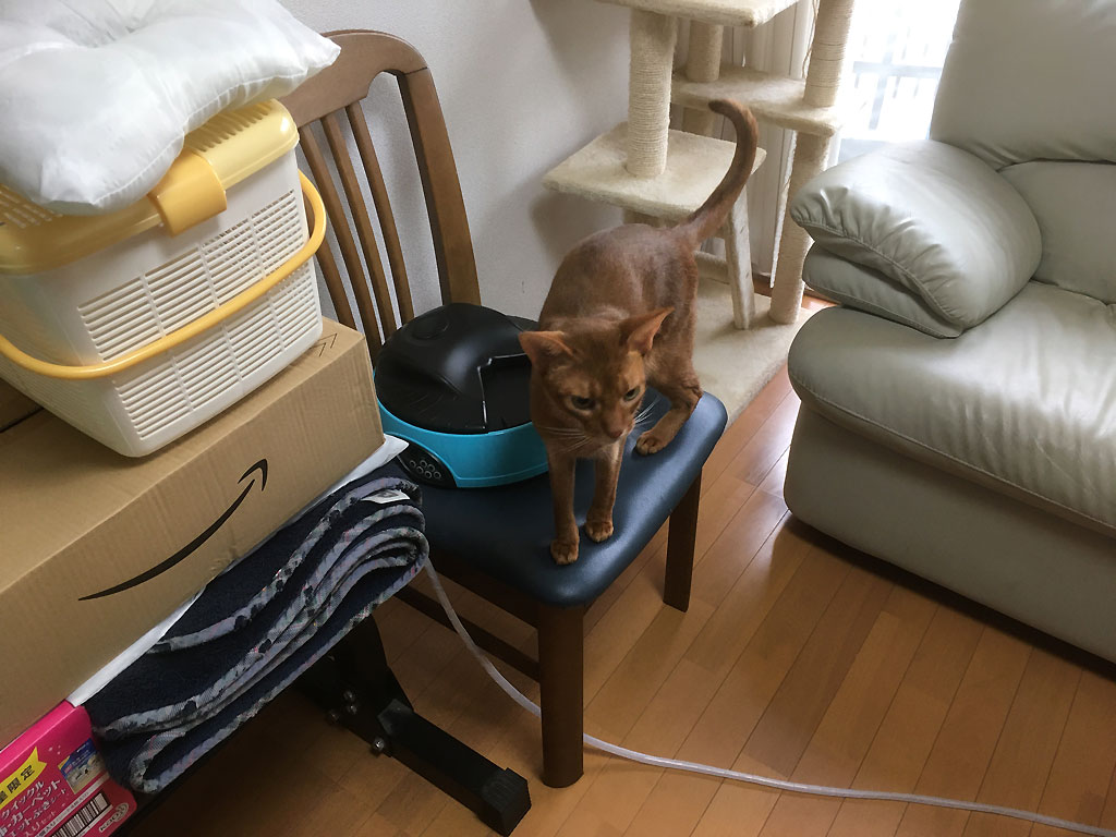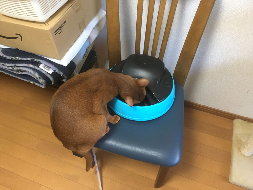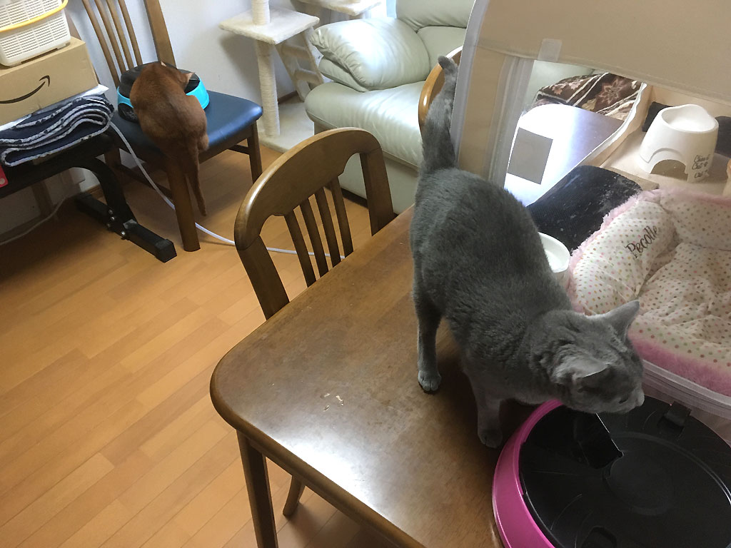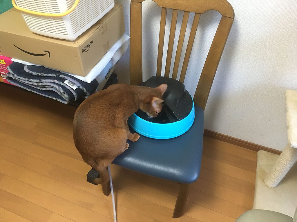 自動給餌器を再開しました…、しっかり完食のアビのすけ君。 コメントを残す これは、4日前の11/14(木)の午後1時過ぎの事、この日からだったか、この日の前日からだったかは忘れましたが、猫たちの自動給餌器を復活しました。 アビのすけの自動給餌器は左の奥にある椅子の上に…、取り敢えず、私の目の届く1階で食べさせようと思ったのですが、場所がなく、地べたに置くのは嫌なので、仕方がなく椅子の上に。 自動給餌器に絡むアビのすけ君。 そして、自動給餌器が動き、カリカリのトレーの戸が開き、アビのすけが食べ始めた。 椅子が狭くて、アビのすけのお尻がほとんどはみ出てる。 でも、単細胞のアビのすけの頭の中にはカリカリしかないので、必死に食べるアビのすけ君。 ロシ子も手前でピンクの自動給餌器で食事中。 そして、しっかりと完食したアビのすけ君でした。