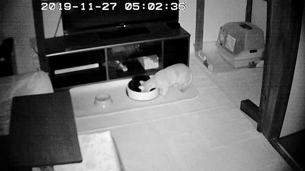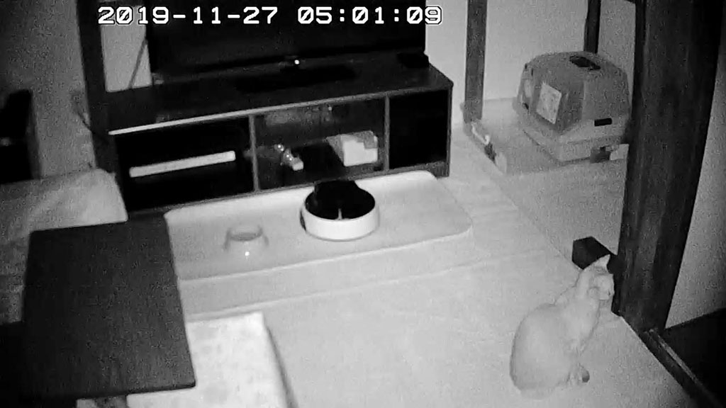 これは、おとといの釜山旅行2日目の未明5時のアビのすけ君…、未明5時に動き始めた自動給餌器でカリカリを食べていたアビのすけ君。。