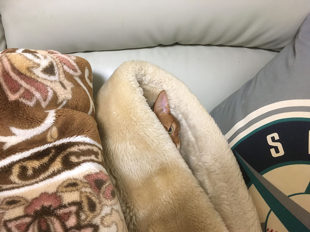 これは、10日程前になりますが、12/1(日)の晩23時45分頃、私もそろそろ寝床のソファーで寝ようかと思ったら、アビのすけが既に私の毛布に潜り込んで寝とった。(笑)