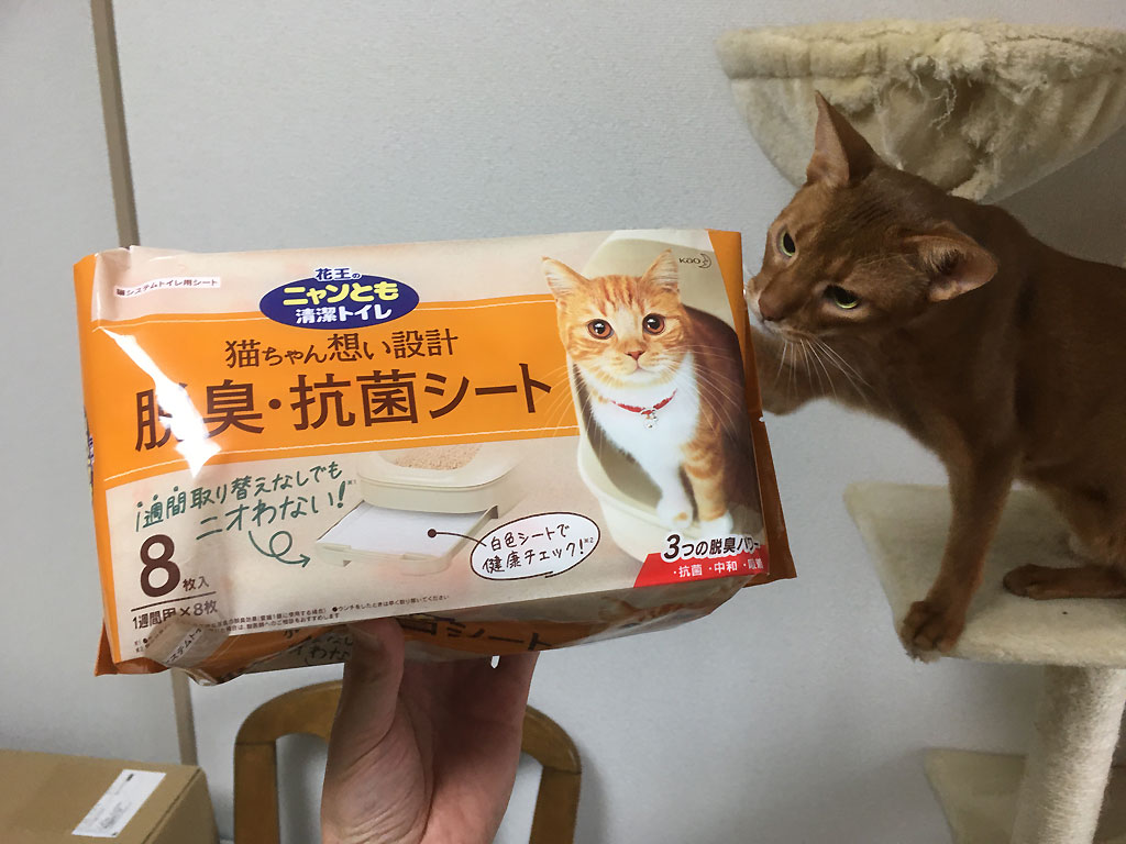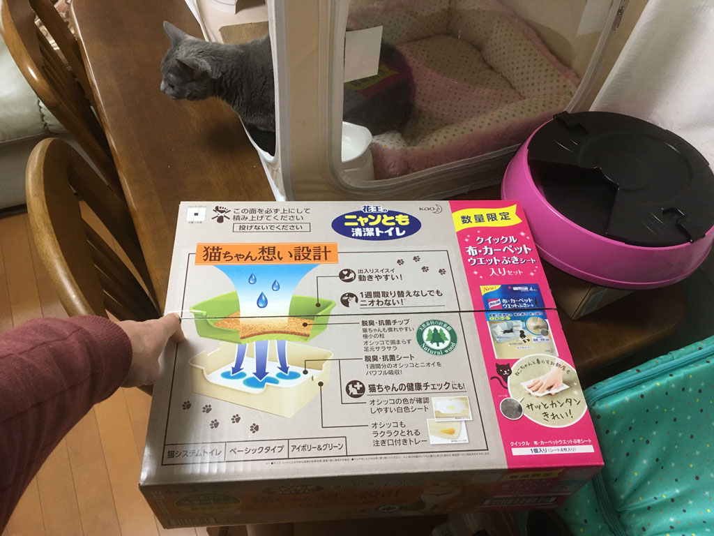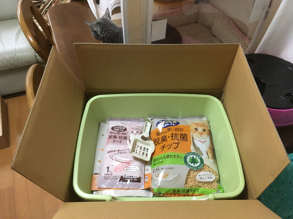 という事で、3ヶ月ちょっと前の8月上旬に買っておいたアビのすけ君の猫トイレの箱を持って来て。