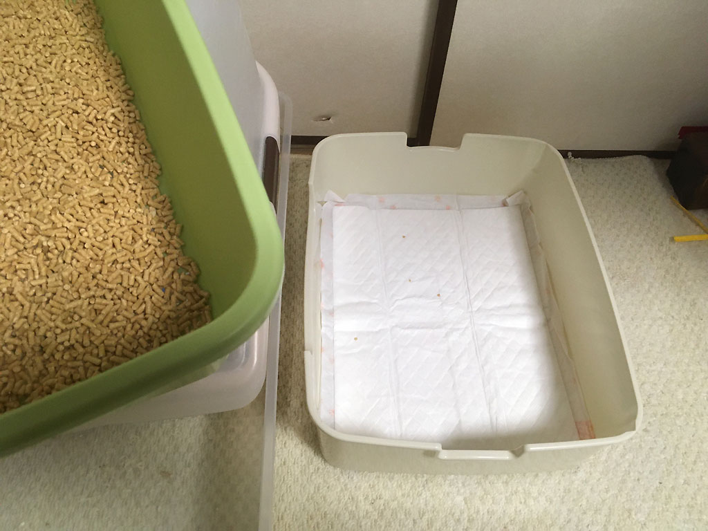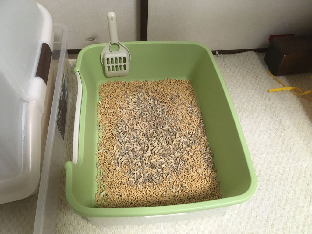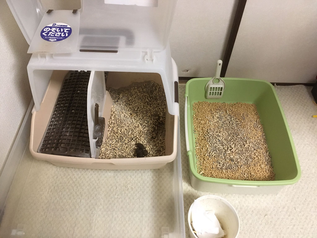 これでは埒が明かないなと思ったので、もっと旧の猫トイレの猫砂を入れてみました…、アビのすけ、早くこっちでトイレをしてくれ…!