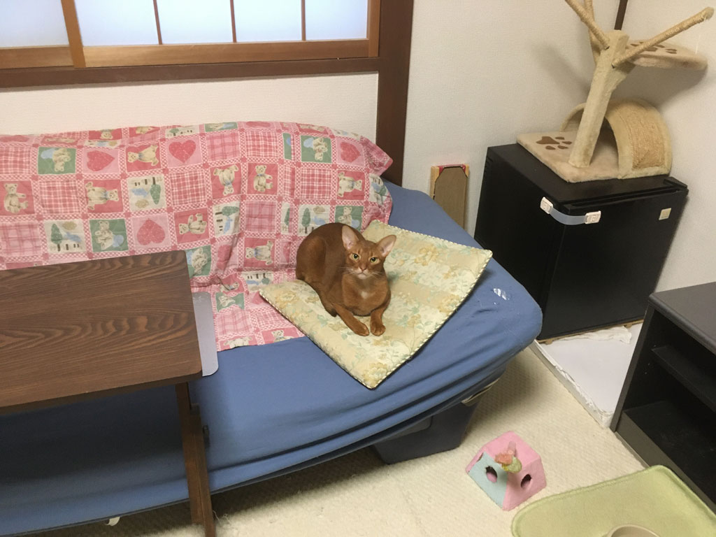 これ、今朝7時半のアビのすけ君…、今日から私、釜山旅行に来ていて、今回もアビのすけをロシ子と隔離して2階でお留守番させる為、この時間の少し前から暖房を入れていたら、アビのすけが早速、2階に。