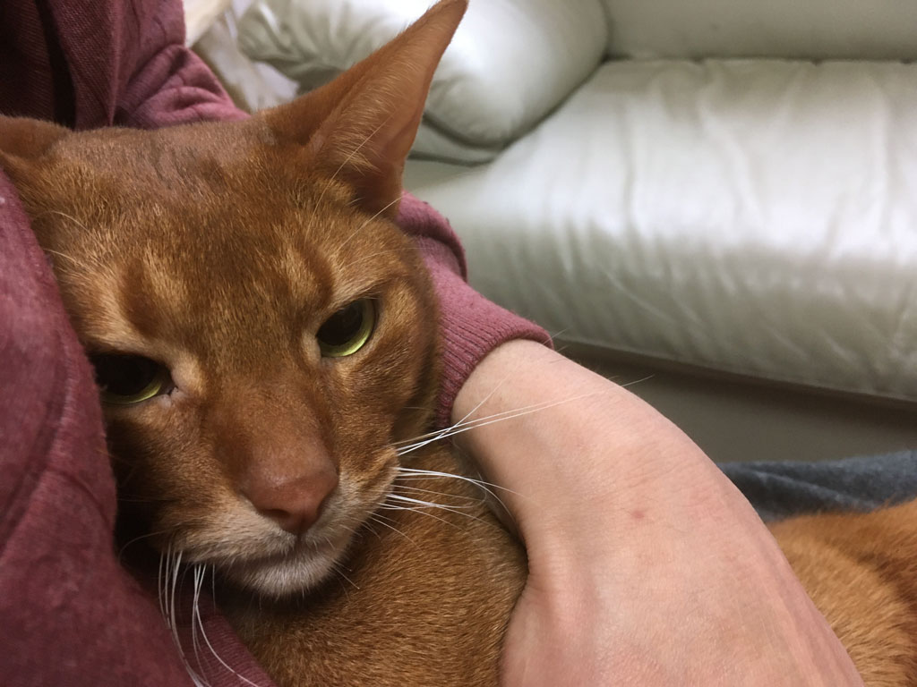 これ、今日の午後1時半の事でしたが、アビのすけの体重を測ろうと思って抱っこしたら、アビのすけの左足の内太ももの所が剥げているのが目に入って来て…、皮膚炎を見つけてしまいました。