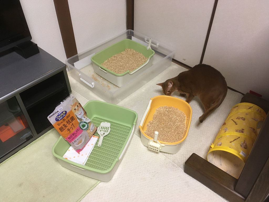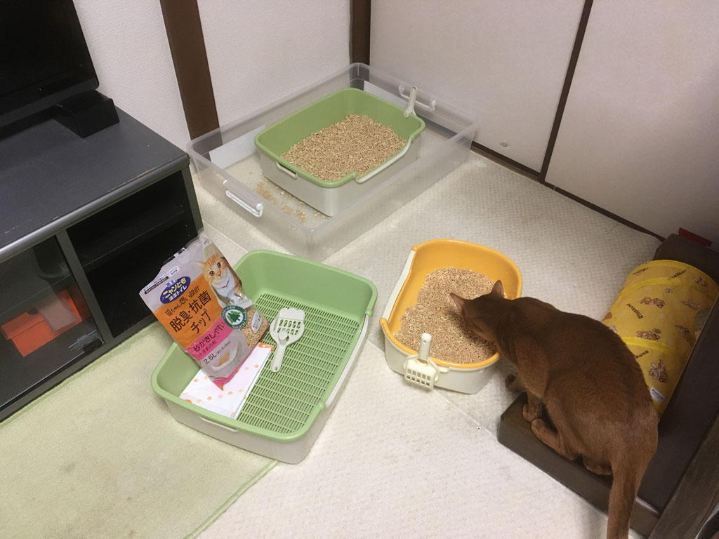 そして、ロシ子の使用済みのウッドチップの猫砂をアビのすけのスペアの方の猫トイレに入れて…、ロシ子の猫砂は常に新しいのに交換しているので、半分以上は湿気っていないので有効活用。