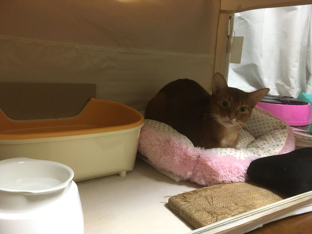 まずはこれ、昨日の未明4時の事でしたが、私が起床して、ロシ子かなって思って酸素ハウスの中を見たら、アビのすけがちゃっかりと香箱座りしてた。(笑)