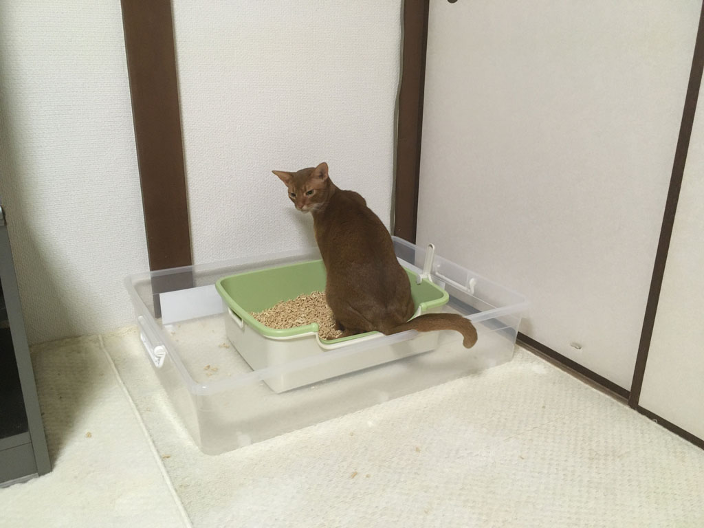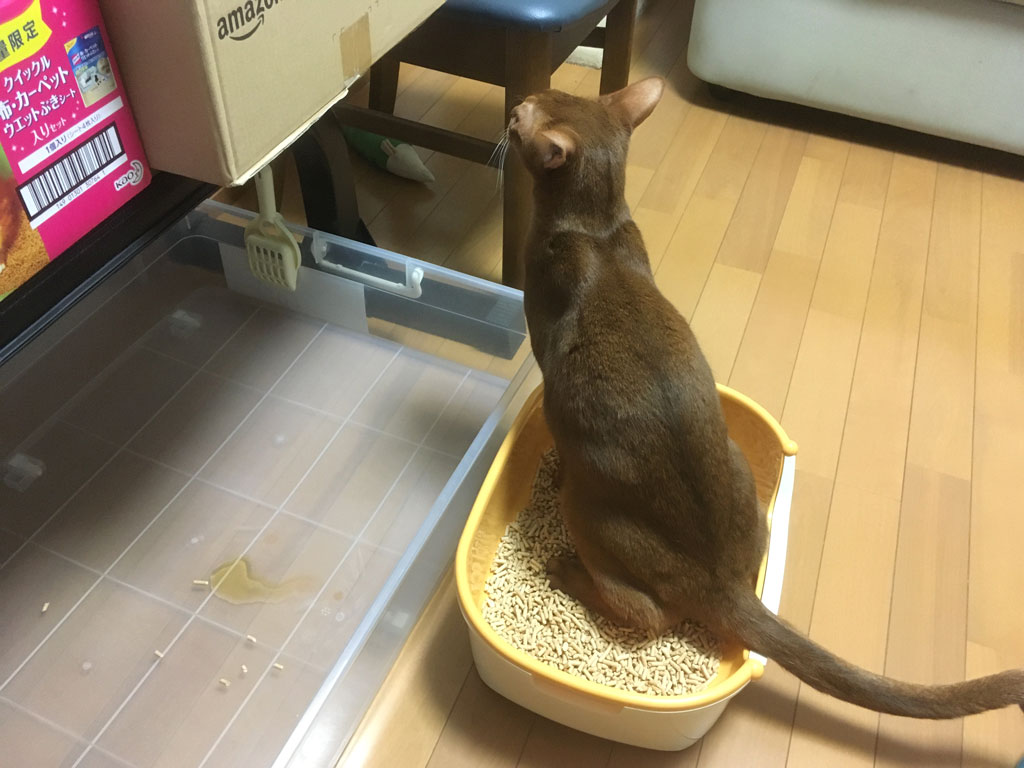 そしてその後、アビのすけが1階に下りて、新たにセットした猫トイレの、トイレではなくてトレーの所で変な座り方をしているなと思って、見に来てアビのすけをトイレに入れて、トイレを移動させたら、アビのすけ、トレーに粗相をしてた。