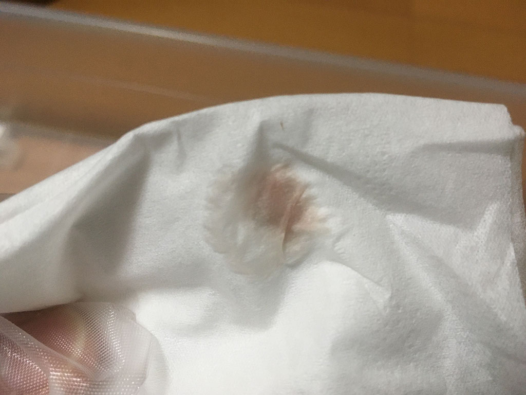 その一滴の所をティッシュで拭ってみたら、ちょっとボケてしまいましたが、やっぱり赤かった。