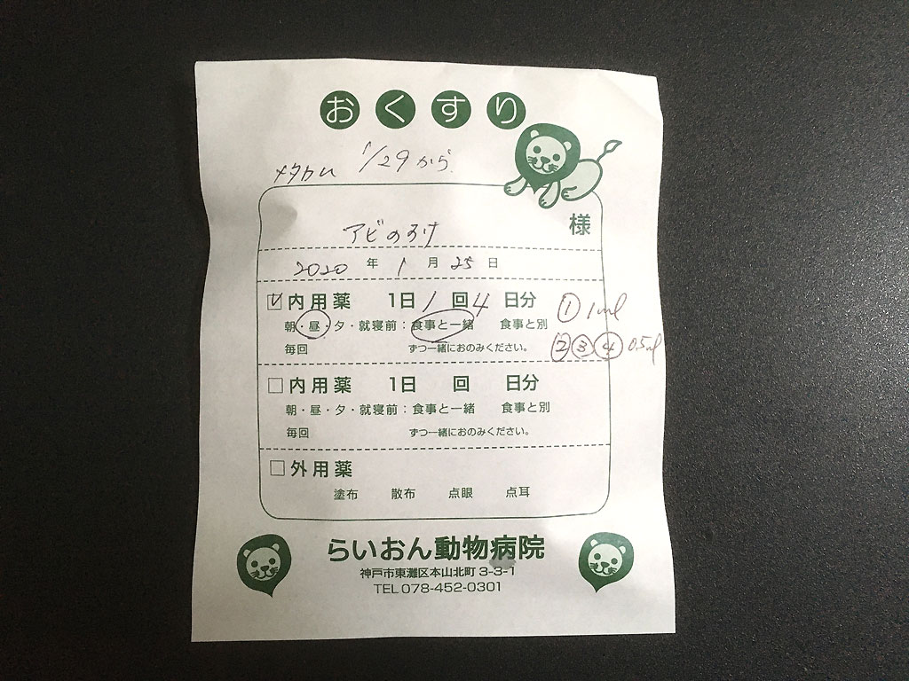 本当はこの日から飲ませ始める所だったのですが、たまたま先生に前日からプレソニゾロンを飲ませてる事を言ったら、同時服用は副作用が出るとの事で、数日あけて、今日から飲ませる様に指示を受けました。
