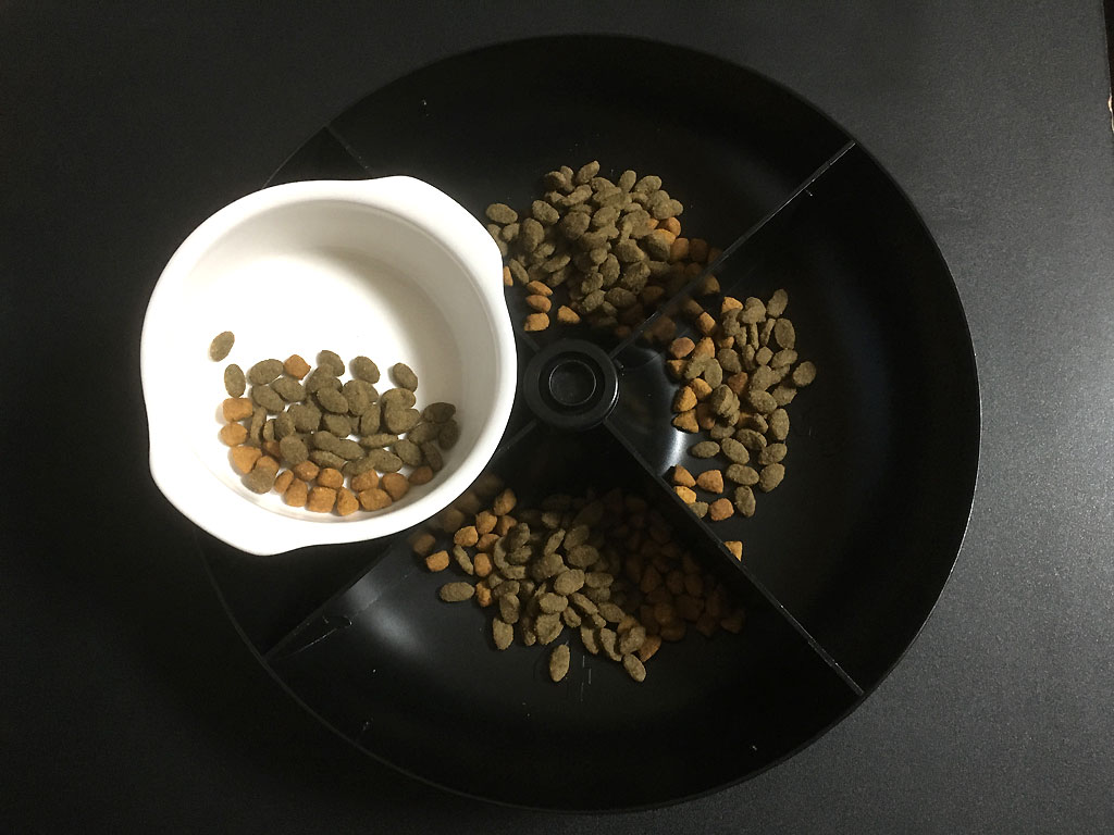 この日はまずは、療法食を1/4と今までのニュートロを3/4の配分でスタート…、以前、皮膚炎の療法食の時に全く食べてくれなかったので、今回は慎重にスタート。