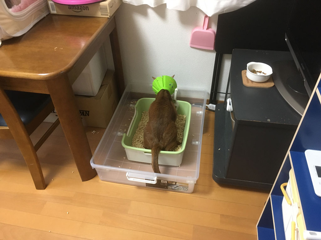 そしてこれは、おとといの2/2(日)の朝9時半、エリザベスカラーを付けたままトイレをするアビのすけ君…、まったく違和感を感じてない感じ。。