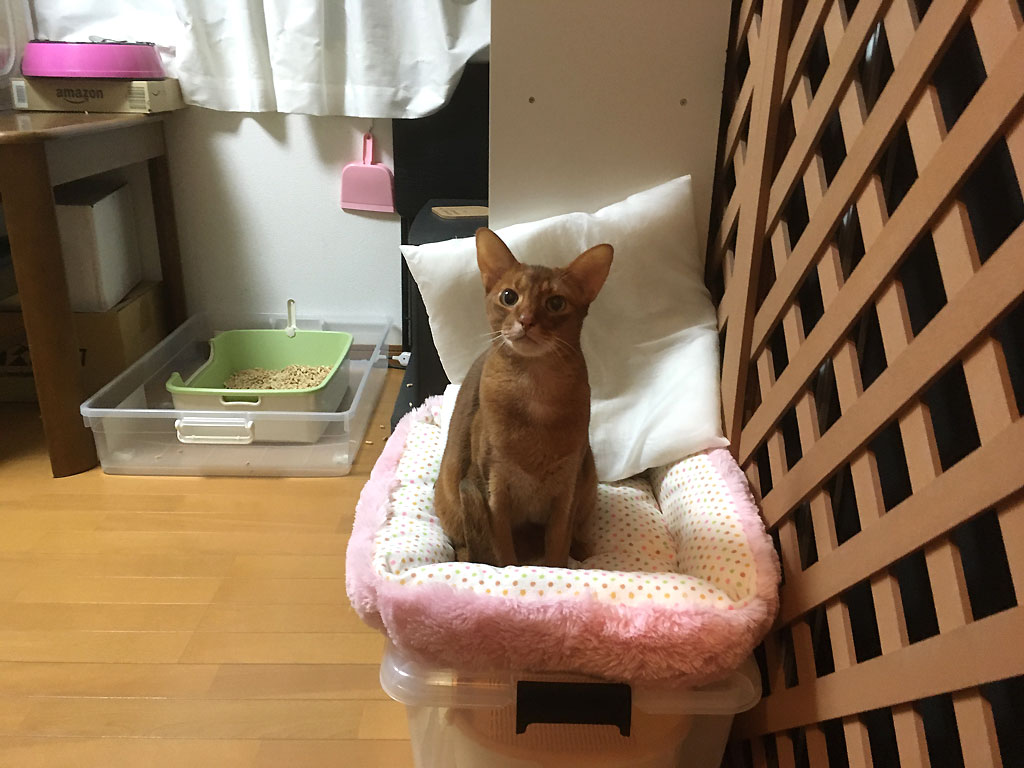これは、同じ日の朝9時半、この日、アビのすけの1階の猫トイレの掃除をしました…、新しい、粒の大きい猫砂を投入。