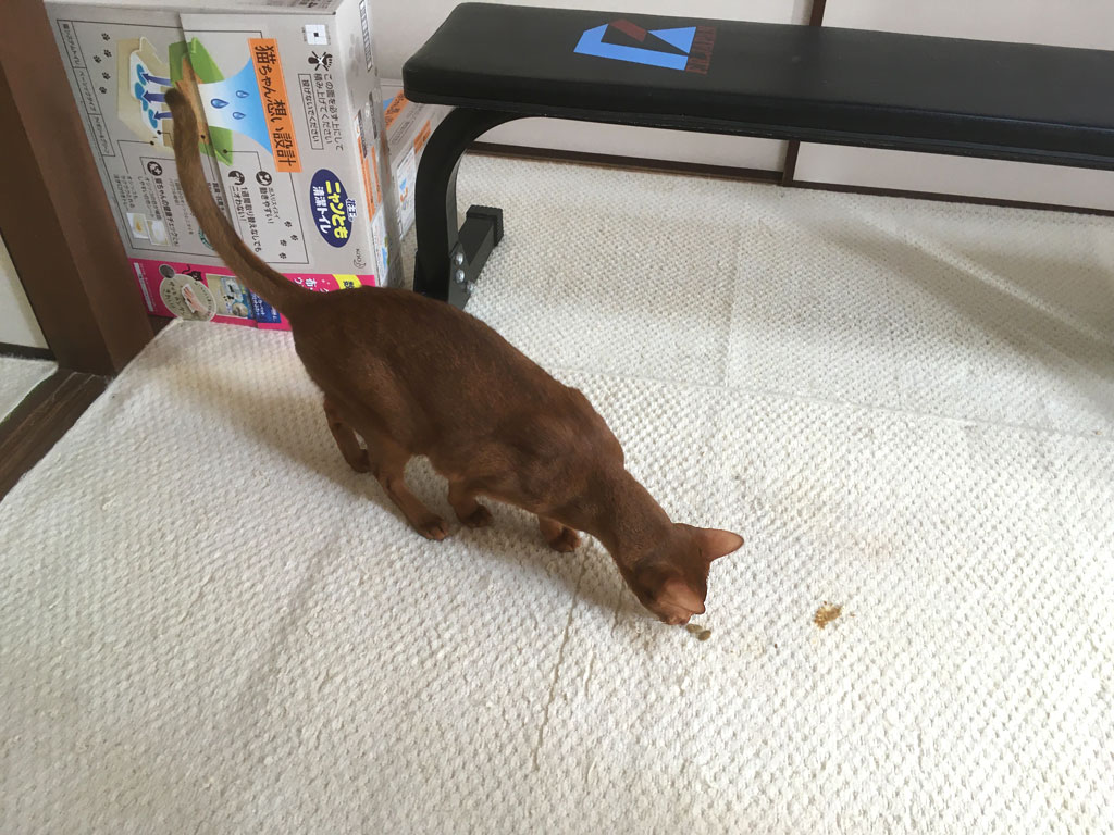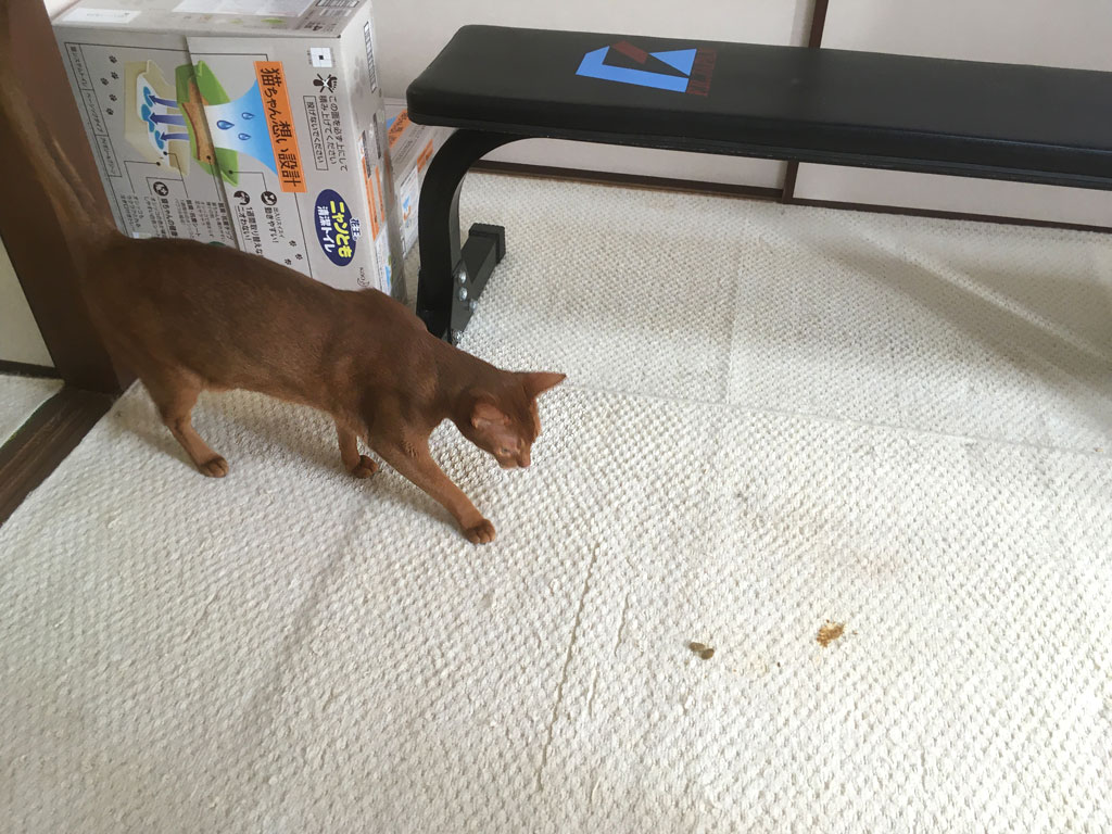 早速、開放した2階でゲロを吐いていたアビのすけ君。(汗) コメントを残す これは、今朝の8時半の事でしたが、2階のアビのすけのトイレ掃除に上がったら、こっちを見たら、アビのすけがゲロを吐いとった…。(汗) と言っても、ほんの小量のゲロ。 乾燥して、パリパリになっていた。 そこへアビのすけ君が参上…、と言うか、アビのすけ、私が2階に上がると、必ず私に付いて2階に上がって来ます。 クンクンするアビのすけ君。 掃除は4~5分で終わりました。