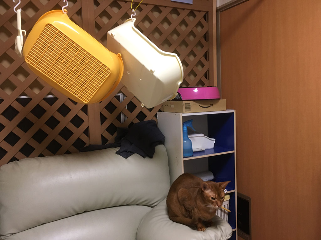 ちなみに、洗って乾燥させている猫トイレはロシ子ので、アビのすけの2階の猫トイレは、この日の翌日に洗いました…、1階の大きな猫トイレは、まだ洗ってません…、明日くらいに洗おうかな…。