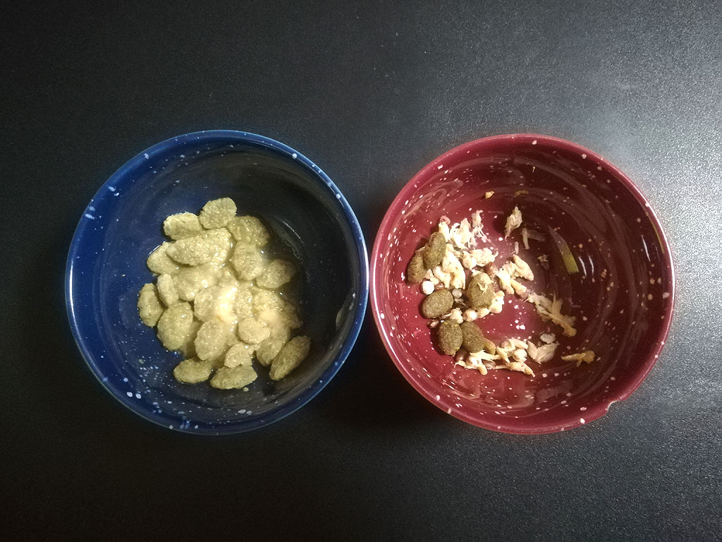 これは8日前、3/5(火)のロシ子が食べてくれなかった朝ご飯…、左側はカリカリをふやかした物で、右側は前日からほぼ食べてくれなかったご飯…、皮膚炎が出来てしまうかもと気になっていましたが、捨ててしまうのももったいないので、アビのすけに食べさせました。